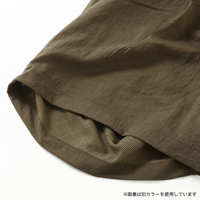 極薄リップストップ生地をワッシャー加工しており、尚且つあえて防風加工をしていないので通気性があり、速乾性が高い素材を採用しています