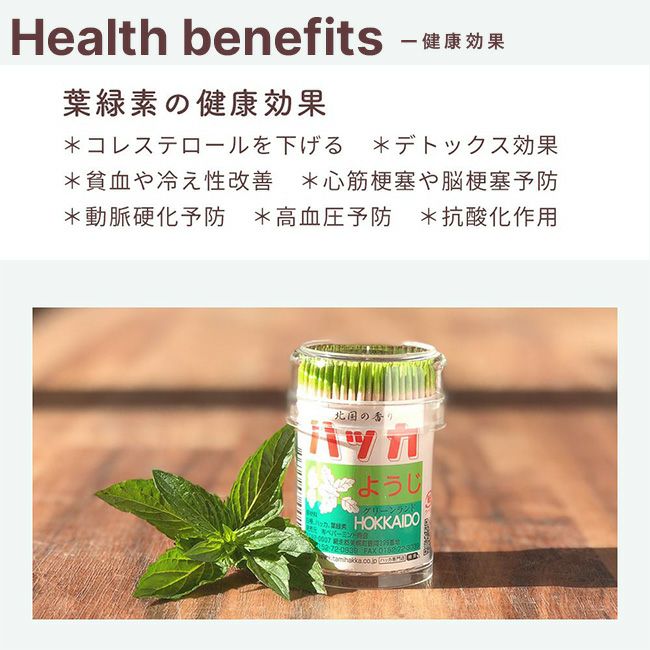 <葉緑素の健康効果>コレステロールを下げる/デトックス効果/貧血や冷え性改善心筋梗塞や脳梗塞予防/動脈硬化予防/高血圧予防抗酸化作用/抗がん/免疫力アップ/消臭・殺菌効果