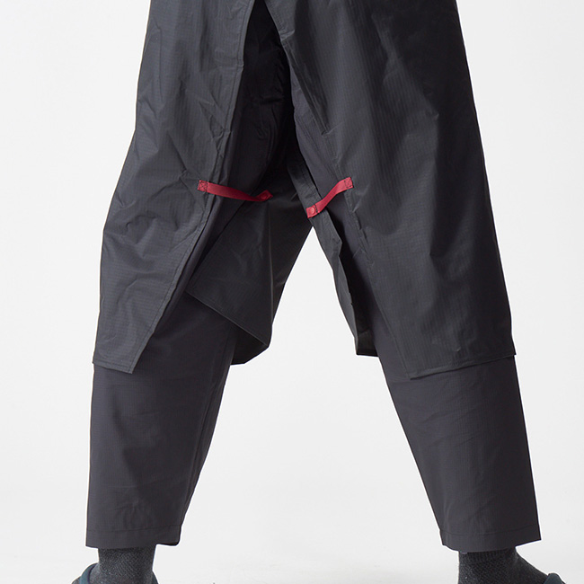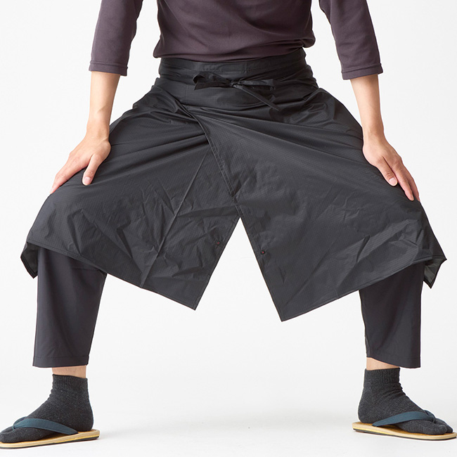 シノギングのフィールドにおいて、レインパンツとは比べ物にならないくらいの運動性とベンチレーション性が実感できて、必要十分な防水性を備えた前掛け型の雨除けです。前掛け型なので後身はカバーしません。後身が開放されているので状況によっては雨に濡れる場合がありますが雨を凌ぐという意味では十分です。少しでも濡れることを避けたい場合にはこの商品を選ばないでください。後身が開放されているので優れたベンチレーション効果と動きやすさを得ることができます。それだけでも十分動きやすいのですが、前中心に生地を重ねて裾を割ることでさらに動きやすさを追求しています。風によるバタつきが気になるときには、脇のテープを膝裏にまわして止めて簡易パンツモードで凌ぐことができます。雨だけではなく風や寒さを凌ぐ事もできるので一年を通して出番の多いアイテムです。