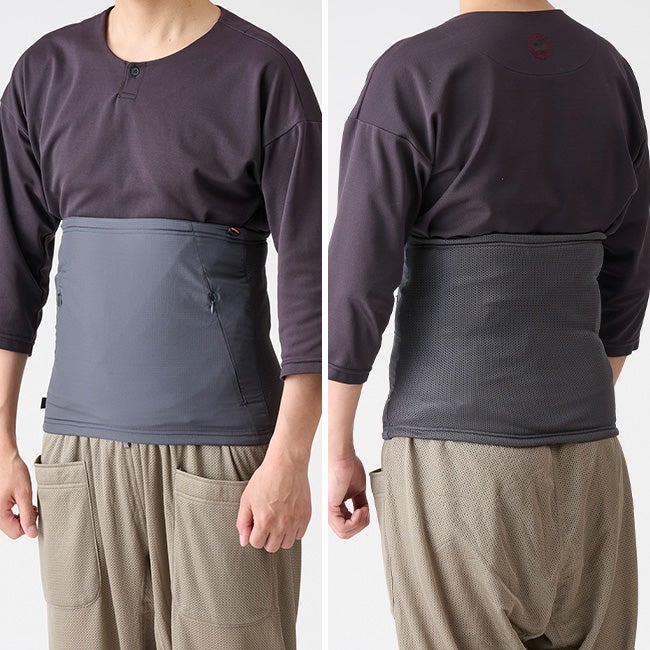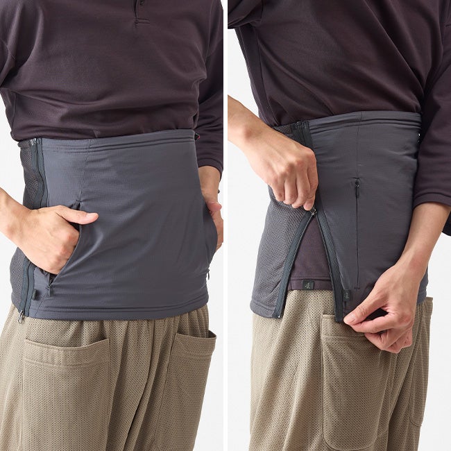 一般的な腹巻と違い、脇のジッパーで簡単に着脱できるため、暑くなったらすぐに取り外せます。