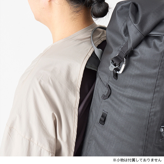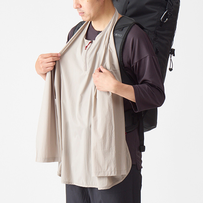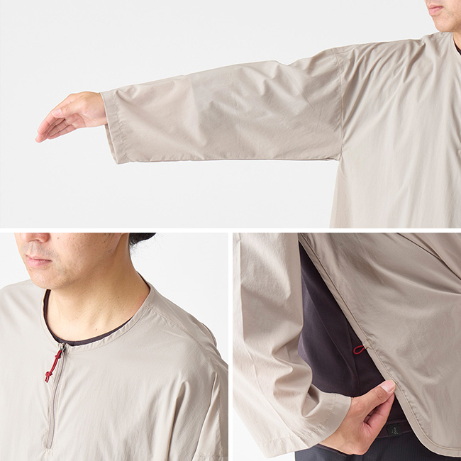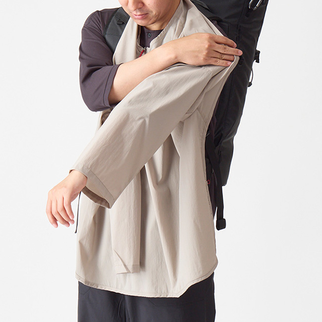 クナドairの通気度は3.0 ㎤ /m² /sと決して高い数値ではありませんが、これは遮断性を優先させているからです。遮断性を優先させるのであれば通気性のない生地を使えばいいのではと思うかもしれませんが、実はこのわずかな通気性のおかげで閉塞感がなく肌へのべたつきや蒸れを軽減できるのです。つまり、急な風や冷えに対してのプロテクション性がありながら着心地も良好ということです。背中とバックパックに挟まれて汗の抜けを邪魔するだけの無駄な生地がないので、それだけ単純に暑苦しさから解放され、同時に汗溜まりを軽減し、短めの袖は手首まわりをすっきりさせ、少し広めの袖口は風の通りを良くします。