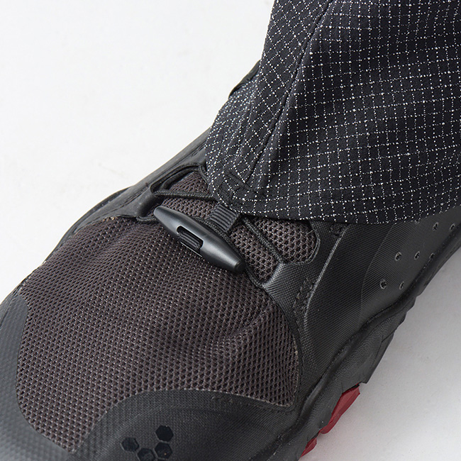 レインゲイターよりも快適に広範囲に使用できるソフトシェル素材のロングゲイター「クナイ」。踏み跡の乏しい尾根や渓を歩くシノギングには、シューズへの異物の侵入を防ぐゲイターは欠かせません。登山・ハイキングをやっていた頃は、防水生地のいわゆるレインスパッツ(レインゲイター)を使っていましたが、生地の透湿性が発汗量に追いつかないために蒸れて結露したり、すぐに外れてしまう金属製のフックにイライラしたりと頭を悩ませていました。シノギングという山遊びを提案するにあたり、レインスパッツとは別物の新しいゲイターを企画する段階で、伸縮性のない生地でも足にフィットする地下足袋は大いに参考になりました。地下足袋の作りを基にして、コハゼを編み上げ式の紐締めに変えることで、ふくらはぎのフィットが容易に調節できるようになり、あのイライラの原因だった金属製フックの代りにトグルを使用することで簡単に確実にシューズに固定できるようになりました。こうして足さばきの邪魔にならず、藪漕ぎや長時間のシノギングにもストレスを感じないソフトシェルのゲイターが出来上がったのです。