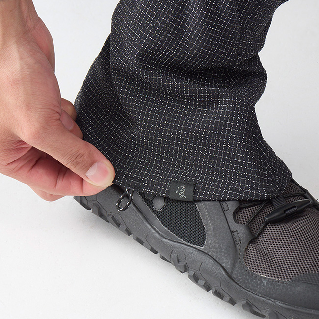 シノギングでは、晴れでも雨でも雪でも、どんな天気でもクナイを使います。もともと防水仕様のシューズを使うことが多くないので濡れることはそれほど気にならず、撥水のメンテナンスをしっかりしておけば何とか凌ぐことができるからです。裾の前のトグルをシューレースにくぐらせてから引き上げて固定します。そして裾の左右のループにバンジーコードや丈夫な細引きを付けてシューズの底に固定することで、裾まわりがシューズにしっかりフィットして、異物の侵入や裾の浮き上がりを防ぐことができます。また、かかとの裏面の面ファスナー(ループ)によって一部のシューズに容易に固定することができます。編み上げの細引きは編み目が見るくらいのゆとりを持たせて、穿き口の内側で一度交差させてから外側に戻して結んでください。こうすることですり落ちてくることがなく、編み上げの模様をきれいに見せることができます。