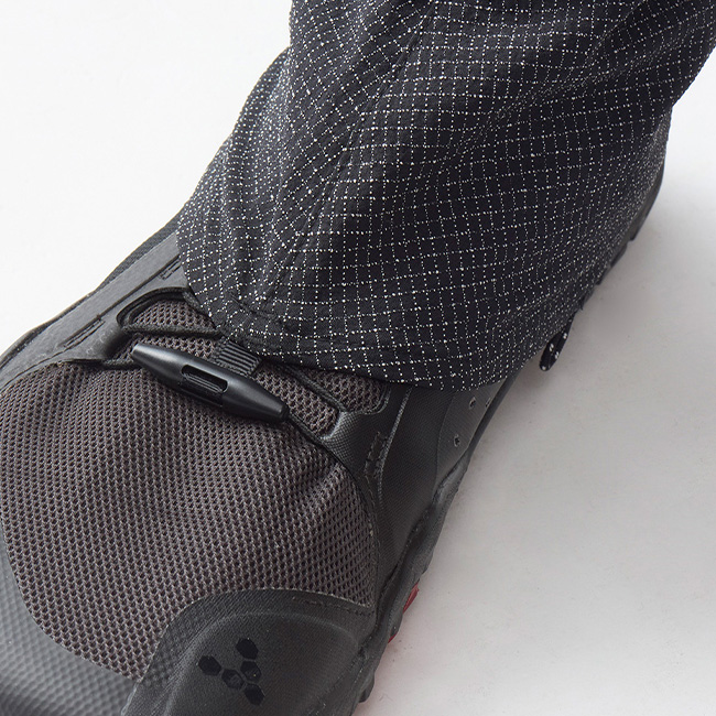シノギングにおいてシューズ内への小石や枯葉などの侵入を防ぐためのミニマルなゲイターです。通気性のあるソフトシェル素材を使用しているのでレインゲイターの様な不快な蒸れがなく、ショートレングスのため両足わずか53gと軽量で、ストレッチ性も備えています。地下足袋をヒントにした細身のフィッティングは長時間のシノギングにおける足さばきのストレスを軽減し悪場における安全確保にも有効です。シューレースに掛けるパーツにはトグルを使用しているので簡単に確実に固定できます。