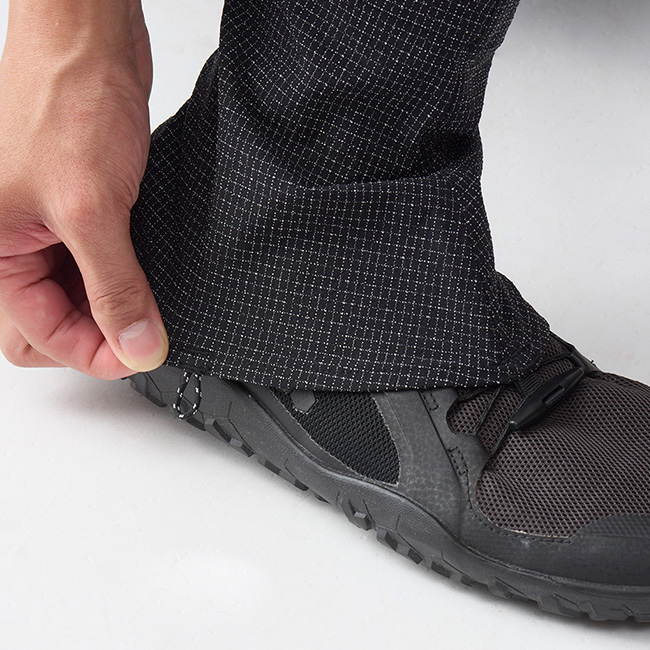 雪のあるフィールドでのシノギング以外であれば、晴れていても雨が降っていてもクナイ・ショートで凌ぎます。もともと防水仕様のシューズを使うことが多くないので濡れることはそれほど気にならず、撥水のメンテナンスをしっかりしておけば何とか凌ぐことができるからです。裾の前のトグルをシューレースにくぐらせてから引き上げて固定します。そして裾の左右のループにバンジーコードや丈夫な細引きを付けてシューズの底に固定することで、裾まわりがシューズにしっかりフィットして、異物の侵入や裾の浮き上がりを防ぐことができます。また、かかとの裏面の面ファスナーによって一部のシューズに容易に固定することができます。クナイ・ショートはフタエズボン、ハカマスカート、アメノスカートと合わせることで凌らしい美しいシルエットを作ることができます。