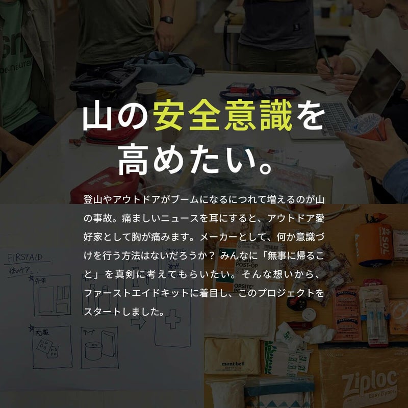 PaaGo WORKSがアウトドアを楽しむためのギアを作ると同時に、安全啓蒙にも力を入れたいと考えて、山岳ガイド、医療従事者などへのヒアリング、アンケート調査を行い完成しました。