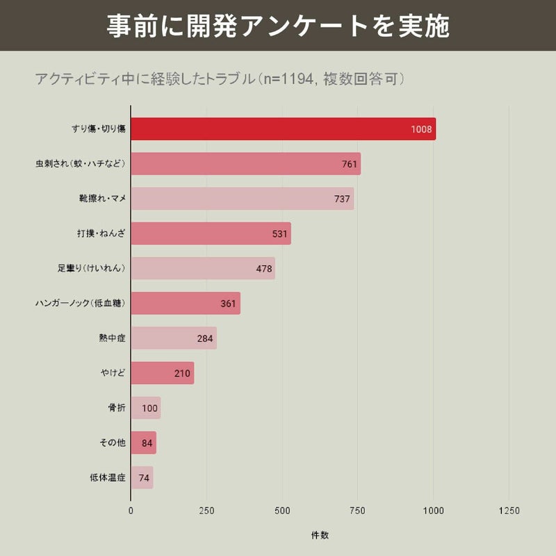 私たちはメーカーとしてアウトドアを楽しむためのギアを作ると同時に、安全啓蒙にも力を入れたいと考えてこの開発プロジェクトを開始しました。山岳ガイド、医療従事者などへのヒアリング、アンケート調査も行いました。自社で行ったアンケートでは回答者(1194件)の8割が山行中にトラブルに遭遇。その安全対策として持ち歩くファーストエイドキットの中身や、求める機能を調査して開発に活かしました。