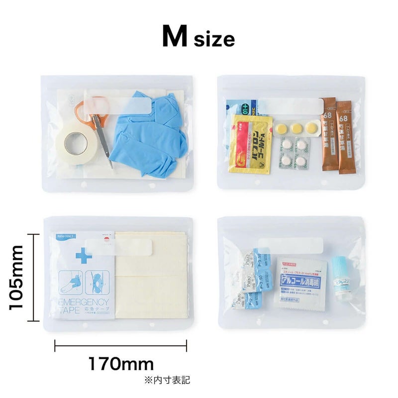 Mサイズには三角巾やテーピング、アレルギー反応時に必要なエピペンも入れられます。写真はアイテムの収納例です。Sサイズ、Mサイズともにジッパーバッグにはメモを記入できる枠があります。