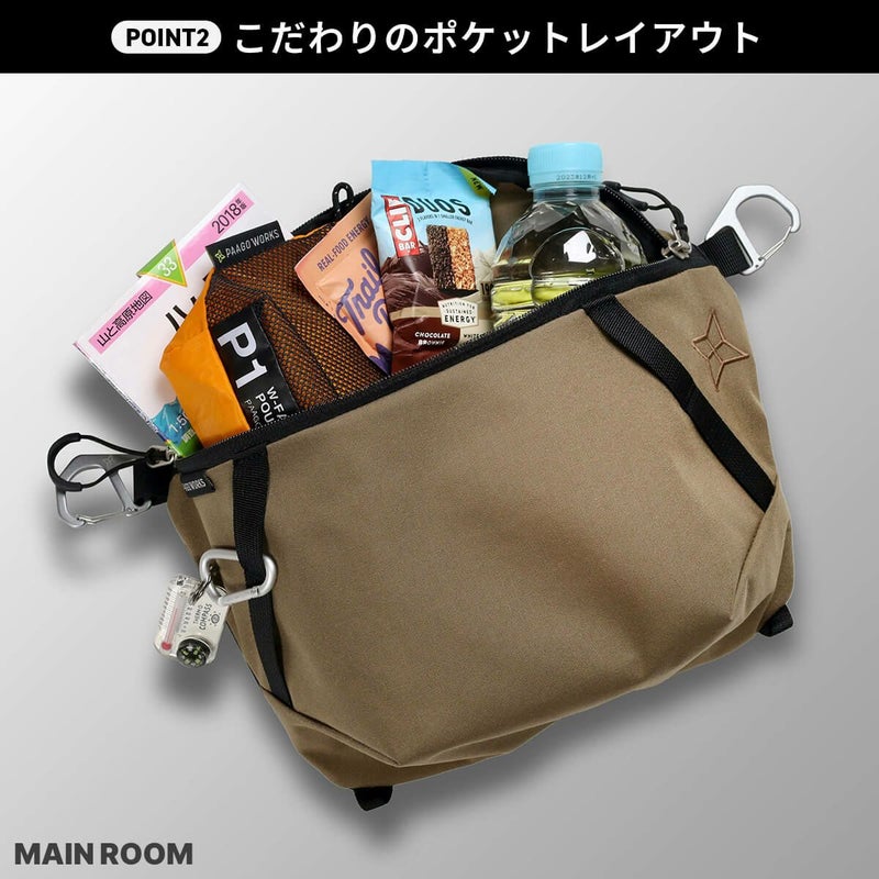 バッグ本体は縦でも横でも斜めでも使えるようにジッパー式を採用しており、徹底的に装備を想定したサイジングを行い、シンプルなフォルム。