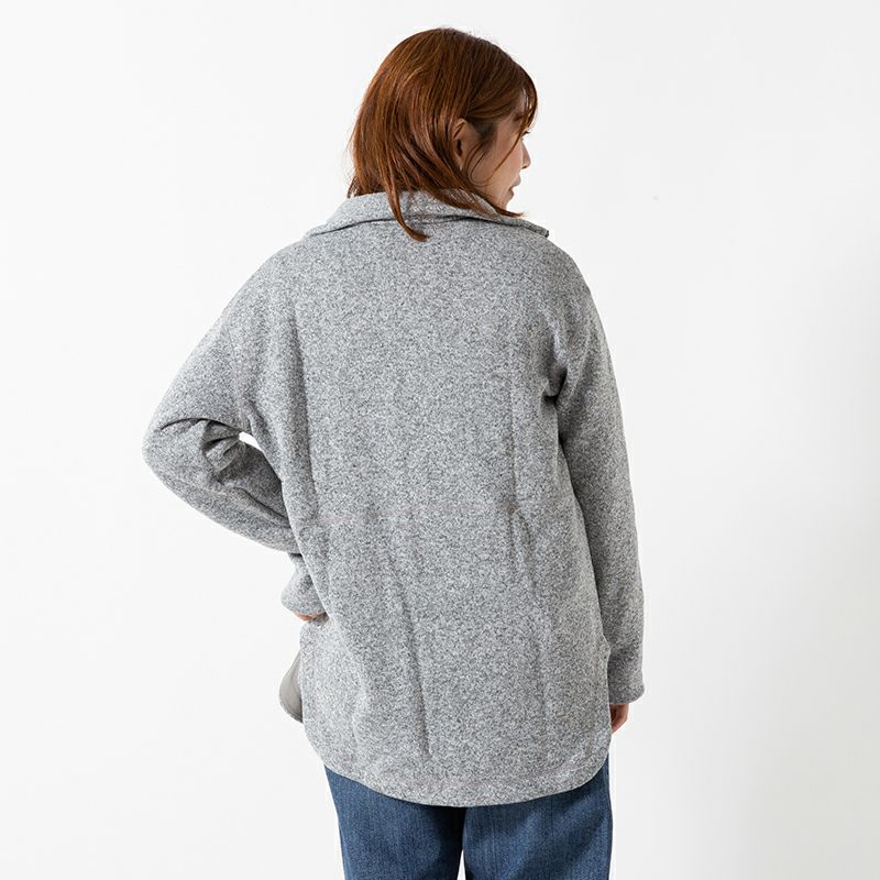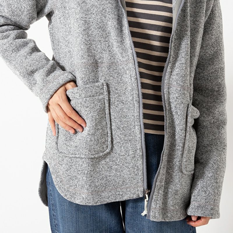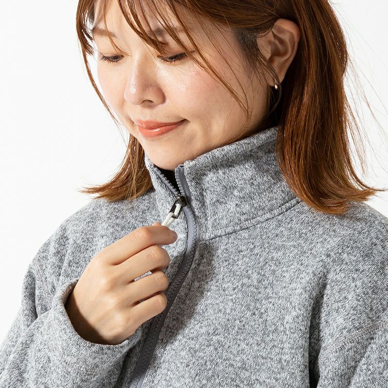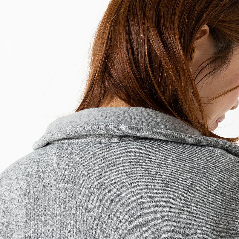 ヘザー色の糸を使用してセーターニットの外側と起毛仕上げの内側を組み合わせた、ソフトで温かく長持ちするリサイクル・ポリエステル100%素材のフリース。従来の方法に比べ、染料とエネルギーと水の使用量を大幅に削減するローインパクトの染色処理を採用