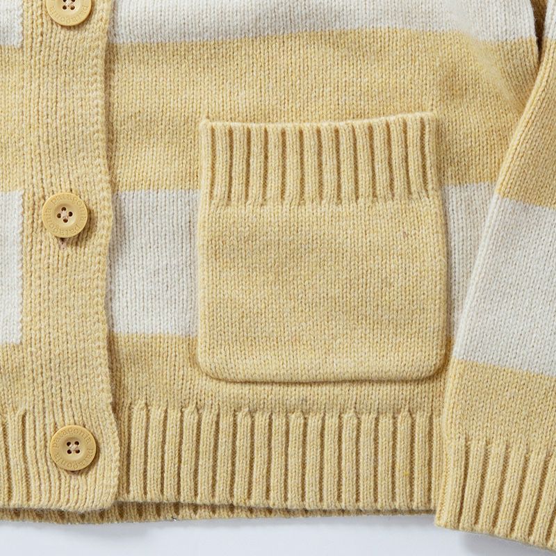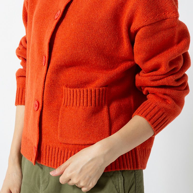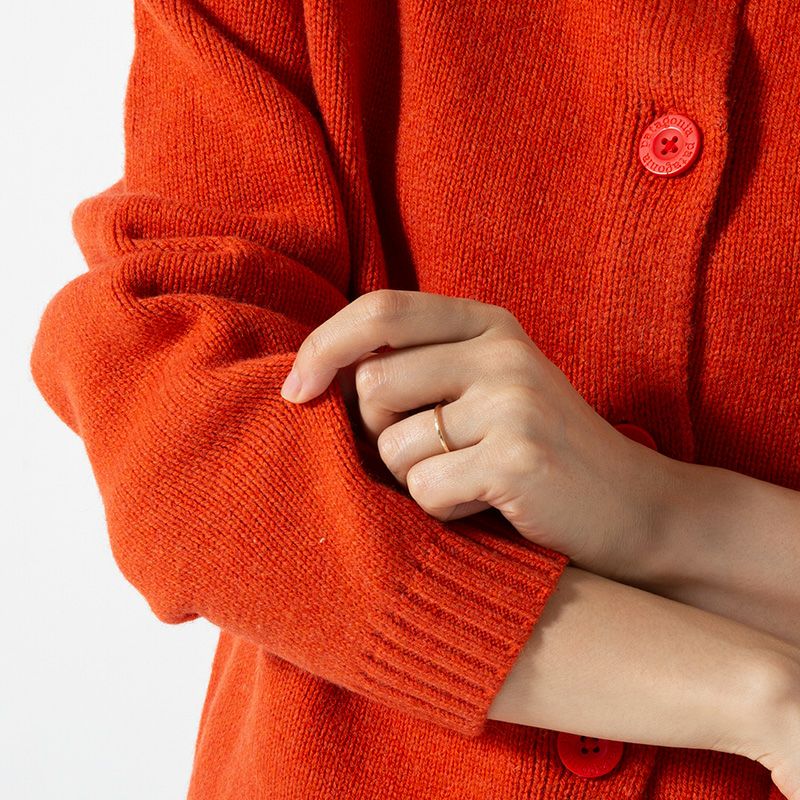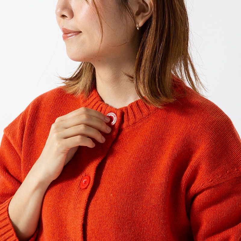 動きやすさと快適さを高めるために肩の縫い目をやや落とし、大きなボタンを付けたボクシー・フィットのカーディガン。