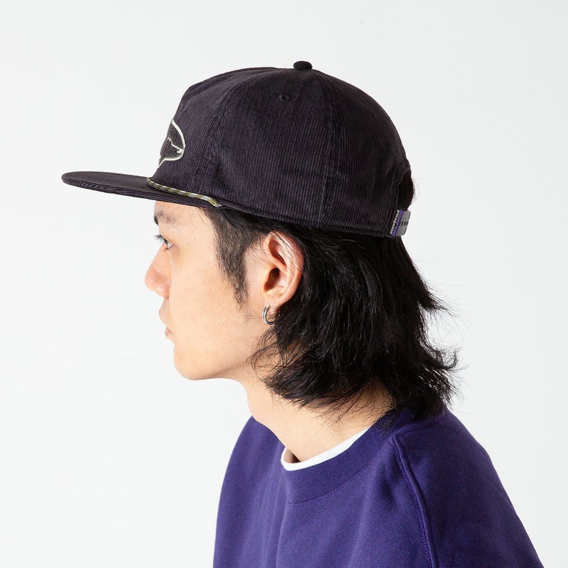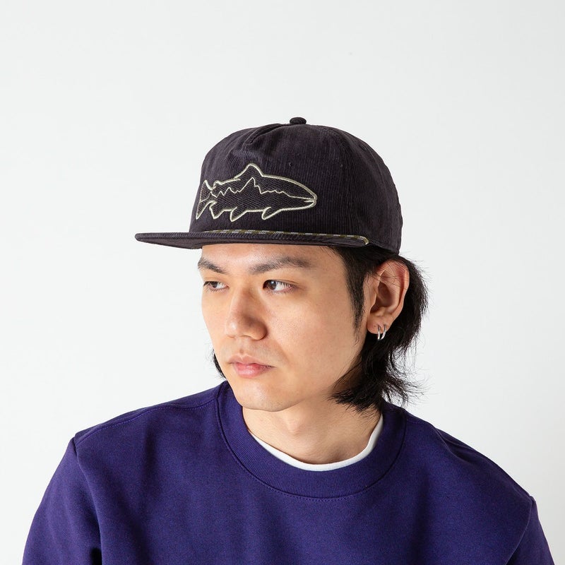 目を引くフロントのパッチにはフィッシング用のフライを留めておくこともできる、頭頂部が高めのオーガニックコットン100%のコーデュロイ製の帽子。