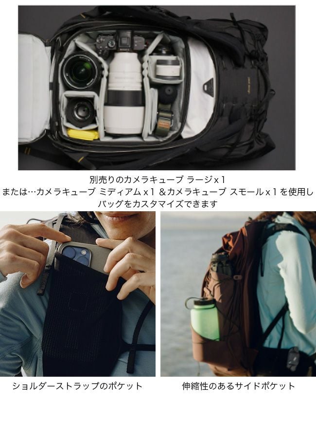 メインコンパートメントはバックパネルを開いて背面からのアクセスも可能で、カメラキューブと組み合わせてアウトドア向けの理想的なカメラバッグとしても使えます。