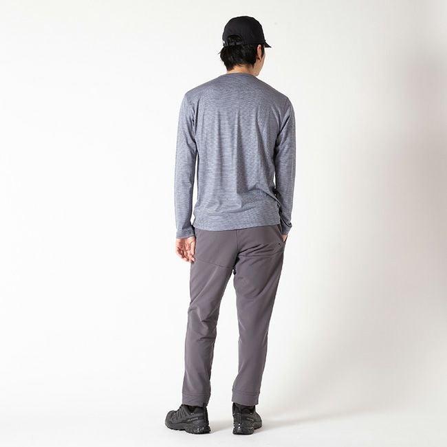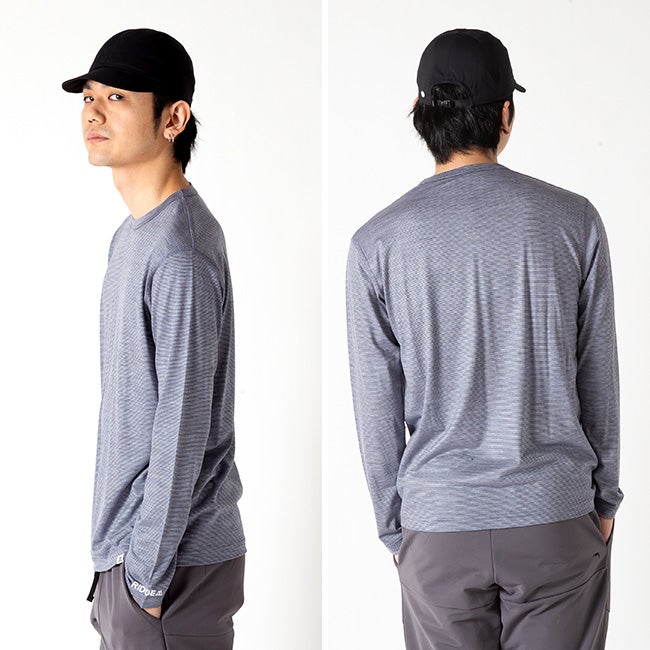 『Merino Basic Tee Long Sleeve "Micro Border"』は、山の朝の澄んだ空気の中でも、街への移動も、日常の何気ない一歩も。