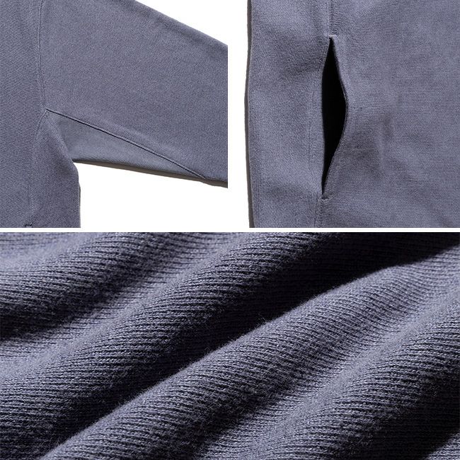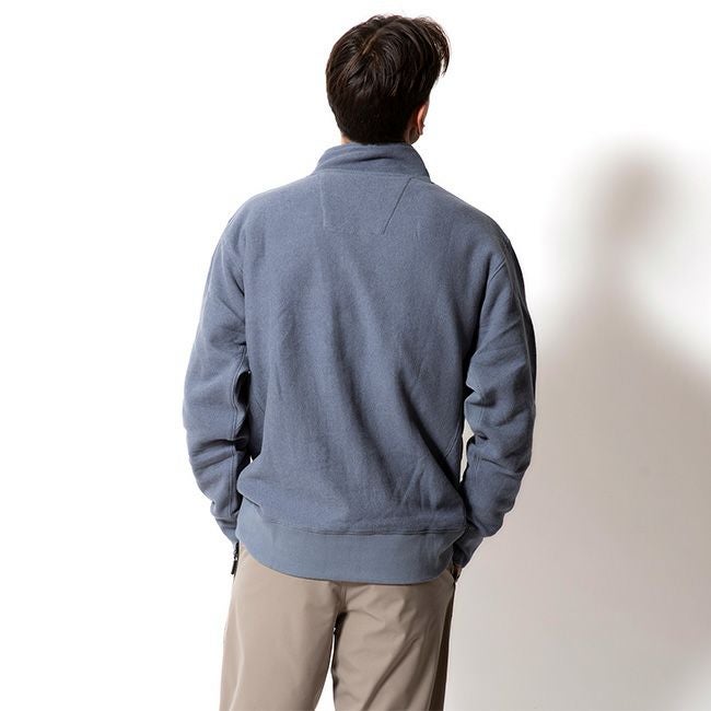 ジップを襟部まで上げてハイネックとして着用したり、ジップを下げれば襟付きのスウェットとしても着用可能な2WAYデザインです。