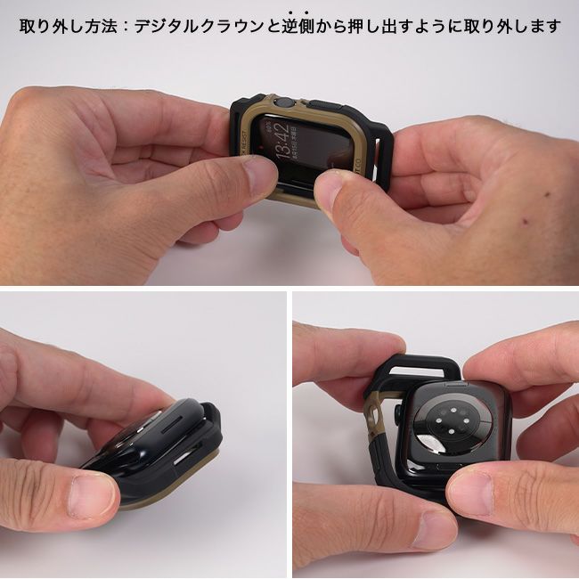 Apple Watch本体を本ケースに嵌め込む際は、「デジタルクラウン側」から先に嵌め込むんでください。(取り外しの際はデジタルクラウンと逆側から押し出すように取り外します。)