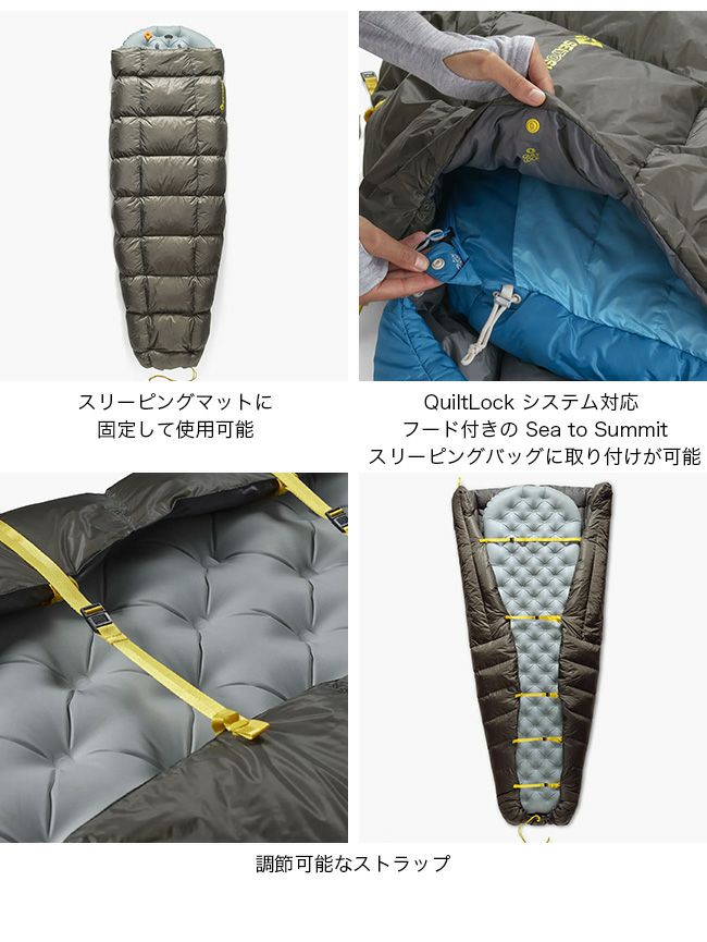 キルトロックシステム:シートゥサミット社のスリーピングバッグにスナップボタンやループで固定し、保温性能の向上が可能
