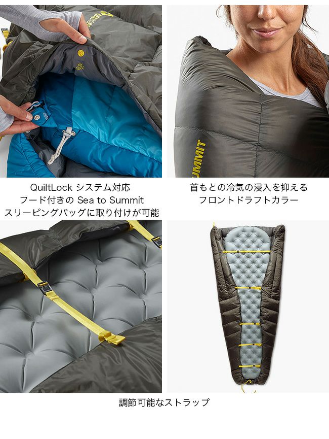 キルトロックシステム:シートゥサミット社のスリーピングバッグにスナップボタンやループで固定し、保温性能の向上が可能