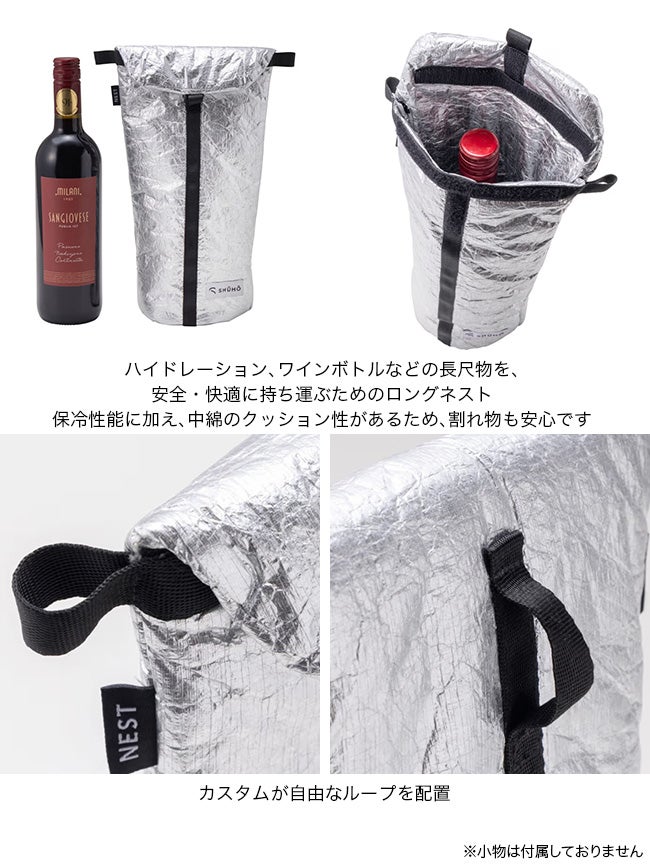 ハイドレーション、ワインボトルなどの長尺物を、安全・快適に持ち運ぶためのロングネスト