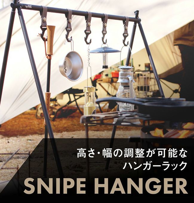 ・ジャケット、コートかけとして・便利なシュラフ干しとして・板を乗せて簡易テーブルとしてご自身に必要な長さを狙えるスナイプハンガーは、時間・場所・人数にあわせて変幻自在!