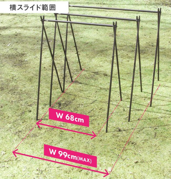 横幅68~99cm、高さ3段階(73cm,95cm,130cm)に対応するため、サイトの広さや、ハングする量にあわせて最適なサイズで使用が可能。