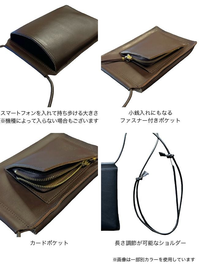 スマートフォンと財布代わりになるファスナー付きポケットを備えたレザーポーチ。
