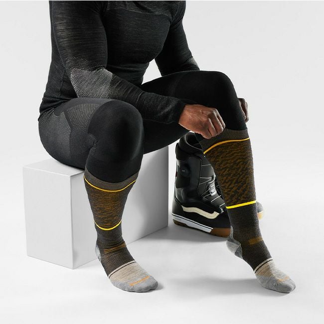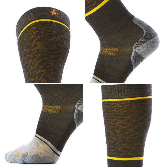 すね∼ふくらはぎ全周、つま先、土踏まず、かかとにクッションを配したスノーボードに適したソックス。