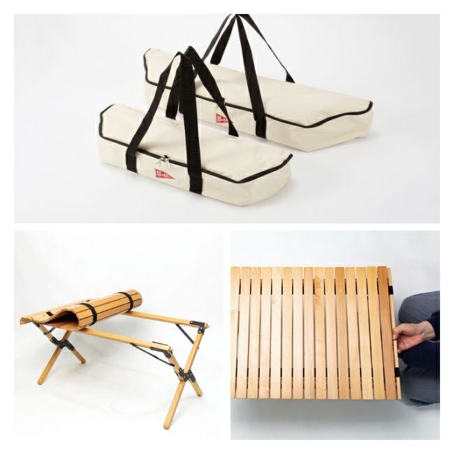 持ち運ぶ時にはテーブルトップを丸めて外し、足を抜いたら片方をくるっと回転させてはめ込めばスリムに畳めます。