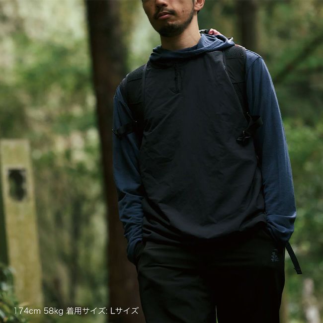 前身頃から肩上までのみOcta®CPCP®をライニング、実測95gに抑えた軽量ウインドベスト。