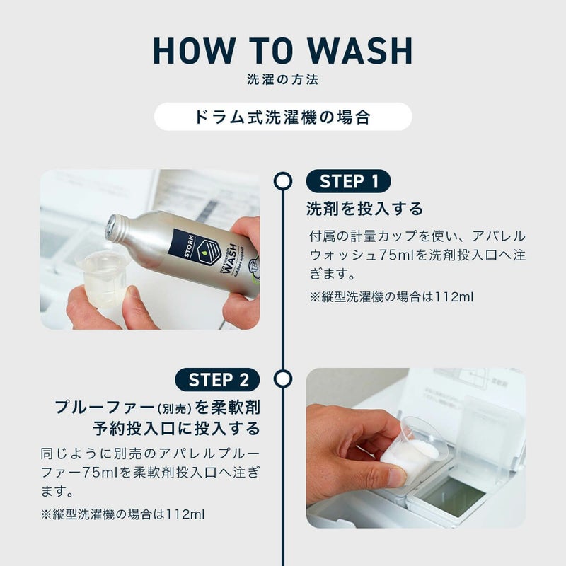 洗剤と撥水剤を一度に入れて洗濯できるワンウォッシュサイクルにより、時間と水を節約しながらウェア本来の機能を回復させ、長持ちさせるハードシェル用洗剤。