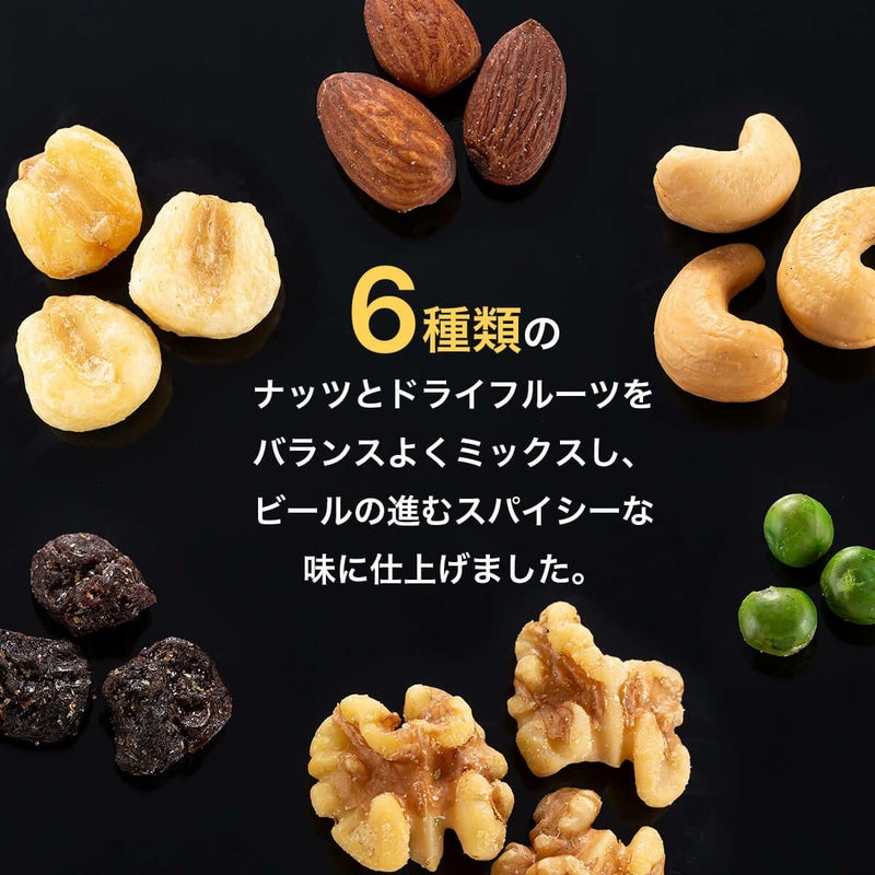 スパイシービアナッツは、ジャイアントコーンやアーモンド、カシューナッツ、くるみなど、厳選したナッツにスパイスをまとわせ、スパイシーに仕上げてあります。