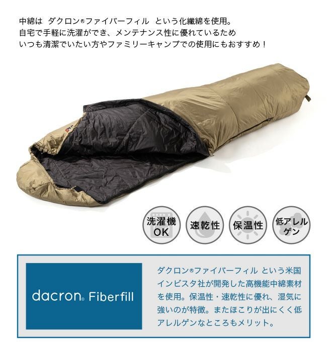 (※ダクロン®は米国インビスタ社が開発した高機能中綿素材)また、ダウンほどコンパクト性はないが、湿気に強く乾きが速いという、化繊シュラフの特徴があります。