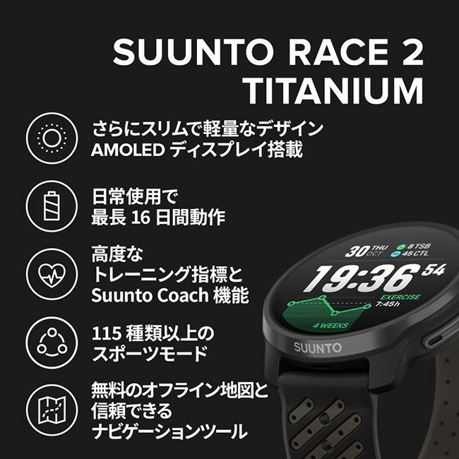 Suunto Race 2 は、重要な場面で最高のパフォーマンスを発揮したいアスリートのためのトレーニング&レース用ウォッチです。