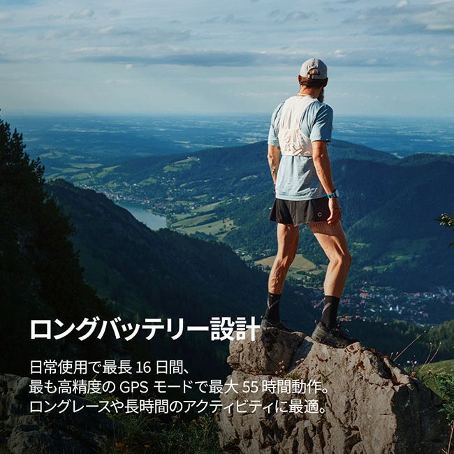 ■バッテリー駆動時間:日常使用(スマートウォッチモード) 最大16日間、トレーニング(パフォーマンスモード) 最大55時間