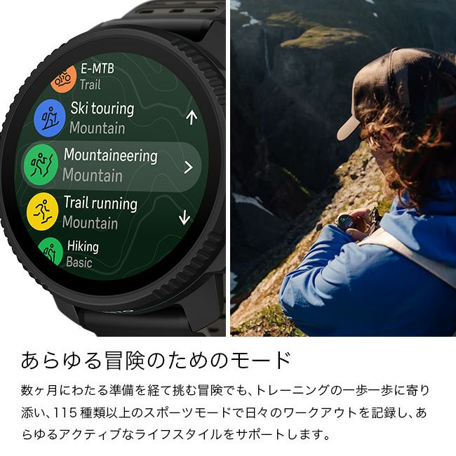 さらに、115種類以上のスポーツモードを搭載し、トレイルランニングやスイミング、マウンテンバイク、スキーなど、多彩なアクティビティを正確に記録。