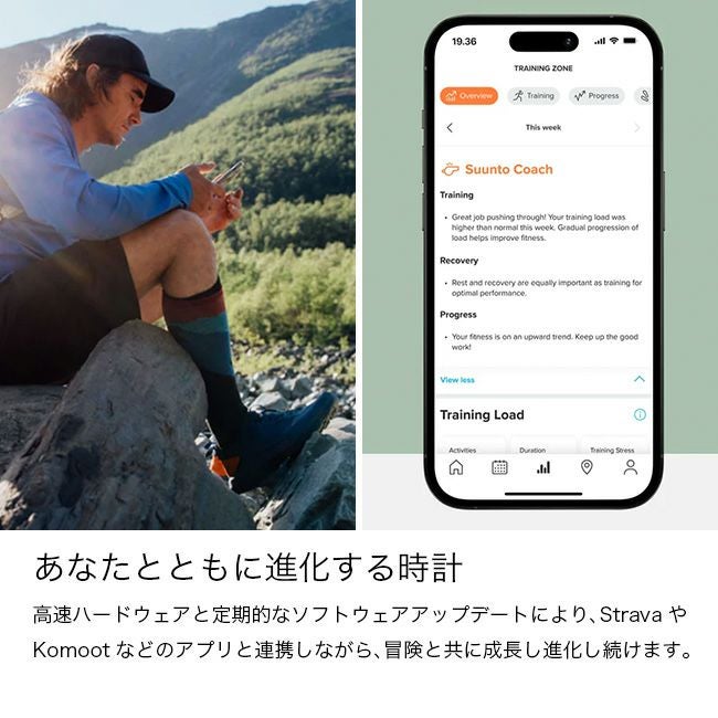 アップグレードされたOHRセンサーが心拍や血中酸素、睡眠のデータをより精密にモニタリングし、Suunto Coach機能がトレーニングの進捗を分析。