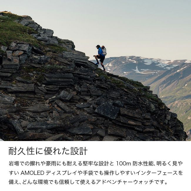Suunto Vertical 2は、岩場での擦れや雨にも耐える100m防水構造を備え、暗闇でも直射日光下でも見やすいAMOLEDディスプレイを採用。