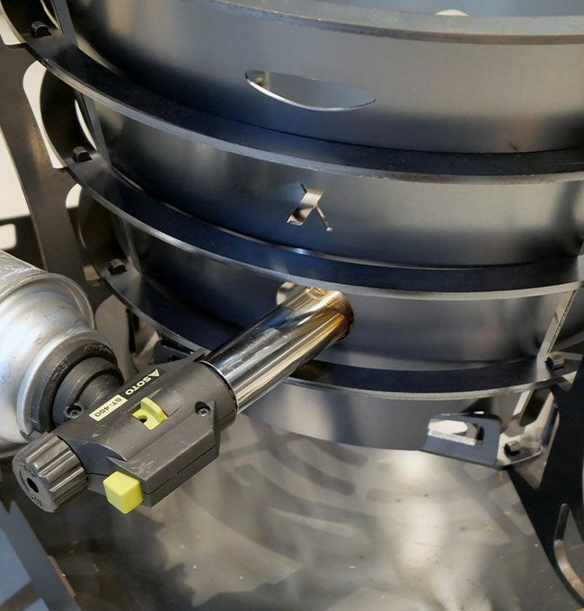 更にFUBOUの上部には使用中に取り除けるようトングを差し込める楕円形のホールを、下部には着火時、炎を効率的に差し込むためのバナー用ホールを設けました。