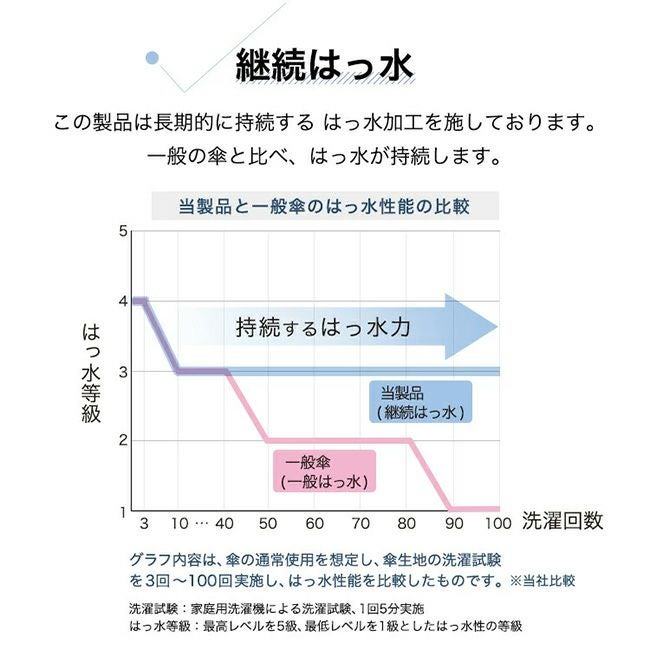 長期的に持続するはっ水加工を施しているため、一般の傘と比べ、はっ水が持続します。