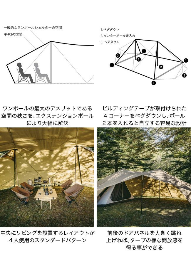 ファミリーキャンプにも対応できる設計で、オプションの「ギギインナー」を左右に吊り下げれば、中央に広いリビングを作って4人が快適に過ごせる空間レイアウトが可能です。