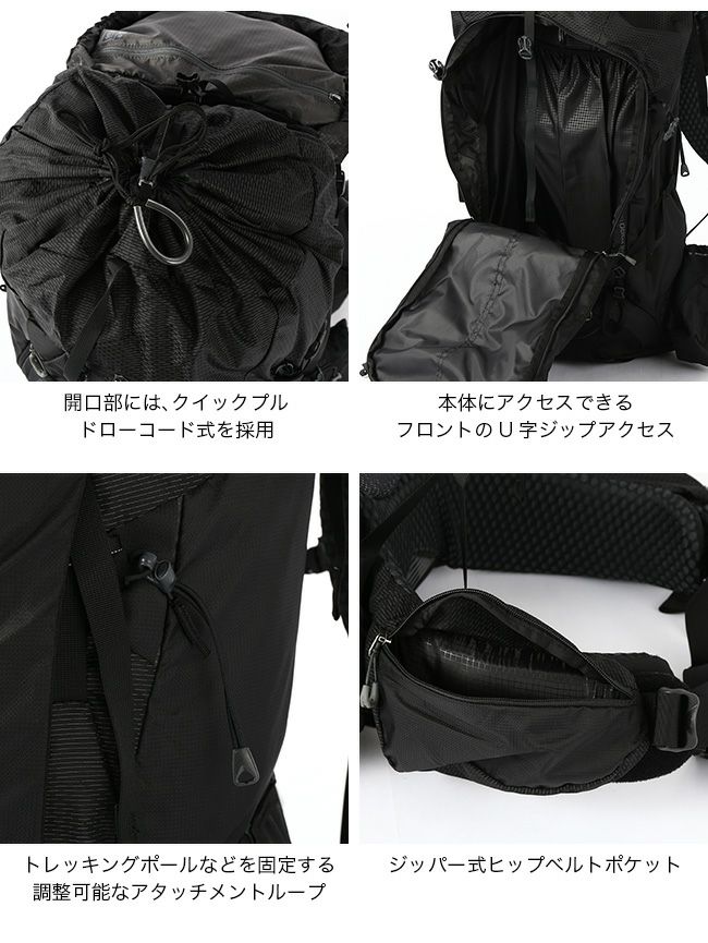 ・ショルダーハーネス、ヒップベルト、バックパックにポリジン?・ステイフレッシュ・テクノロジーを搭載(ニオイの原因となるバクテリアの増殖を防ぐ防臭処理)。