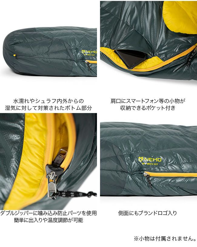 リフは800FPの撥水加工済みダウンと最先端の軽量素材、無駄を削ぎ落としたデザインを組み合わせることで、スプーンシェイプのシュラフの中で、最も軽量かつコンパクトな収納サイズを実現しています。