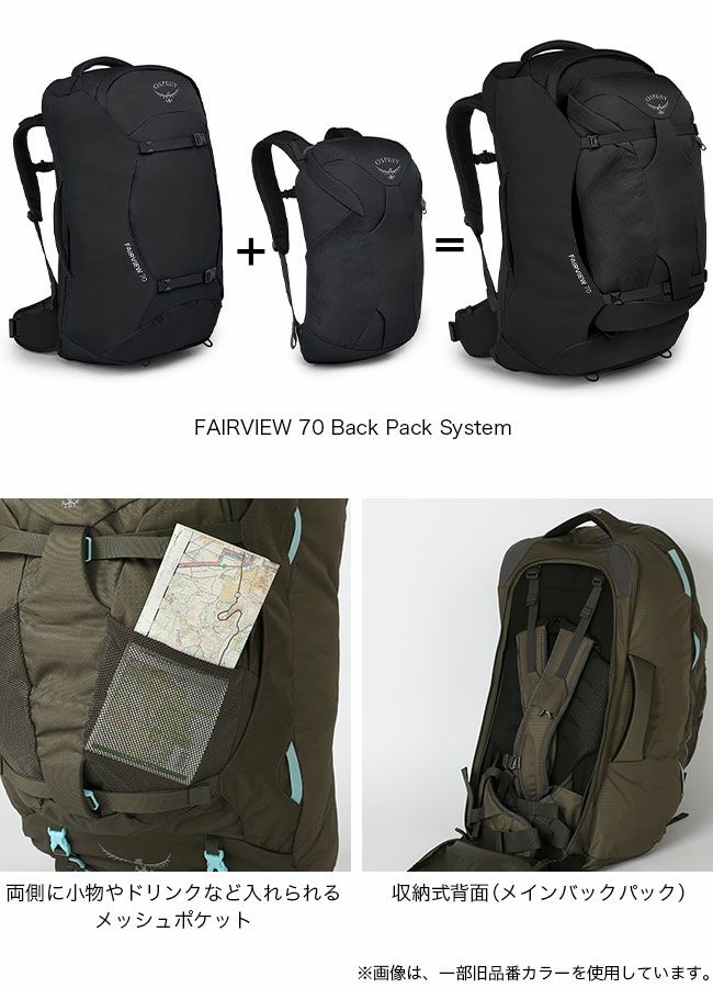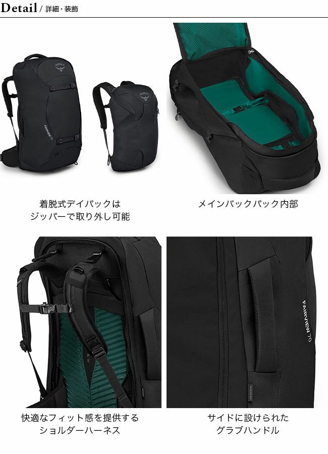 付属のデイパックはデイトリップで使用することができ、メインパックにはもちろんショルダーハーネスにも取り付け可能でチェックイン時などでもとても便利です。