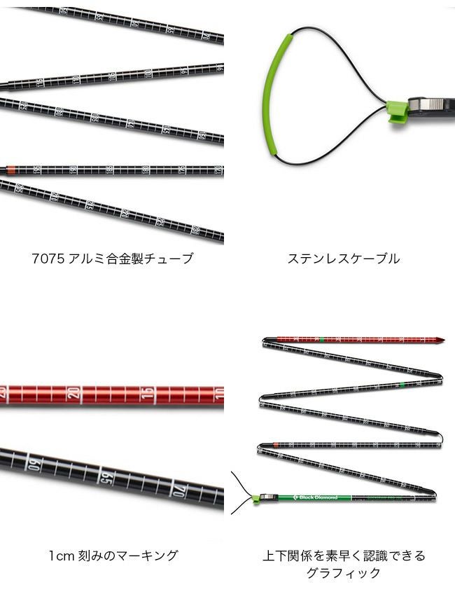 カラビナと同じ7075アルミ合金を使用したアルミシャフトに、プロービング中に伸びが少なく耐久性の高いステンレスケーブルを組み合わせ、耐久性と使いやすさを重視したUIAA認証アルミプローブ。