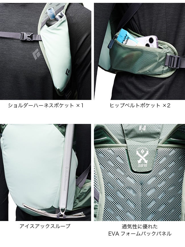 さらに、Zポール固定機能やハイドレーション対応、アイスアックスループを備え、さまざまなアウトドアシーンに対応。