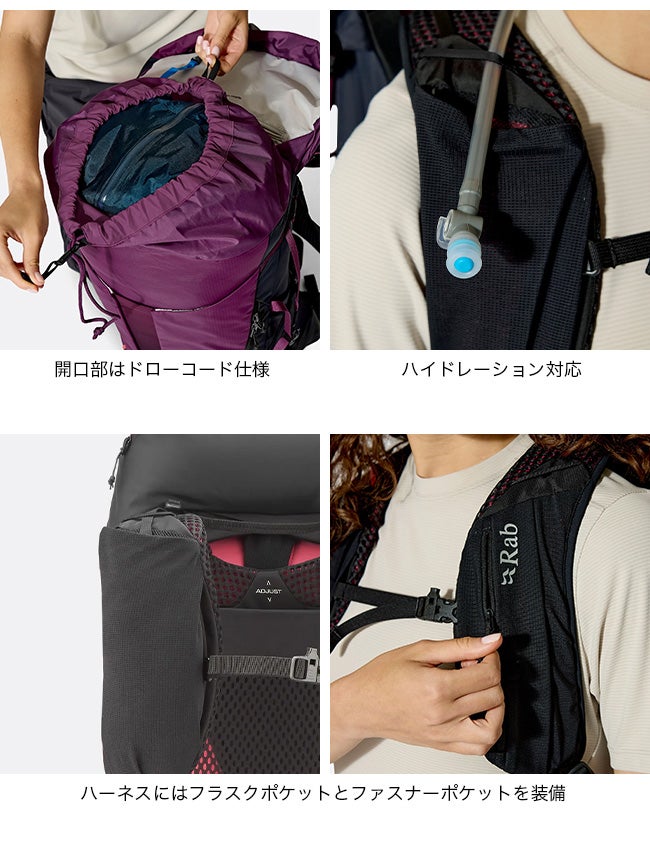 ・3Lハイドレーションブラダー対応の内蔵スリーブ(H2Oポート付き)