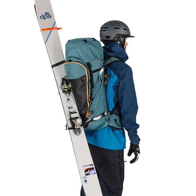 スキーは斜め掛けやAフレームでも装着可能、もちろんスノーボードも装備可能。