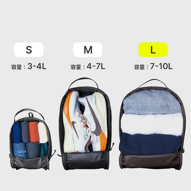 Lサイズは容量7-10Lで、Mよりも幅が7cmワイドなので、厚手の衣類やまとめて持ち運びたい荷物向けです。