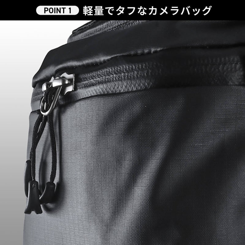 防水性・防塵性が高い点も特徴です。メインアクセスは止水ファスナーのため、大事な機材を雨や埃から守ります。