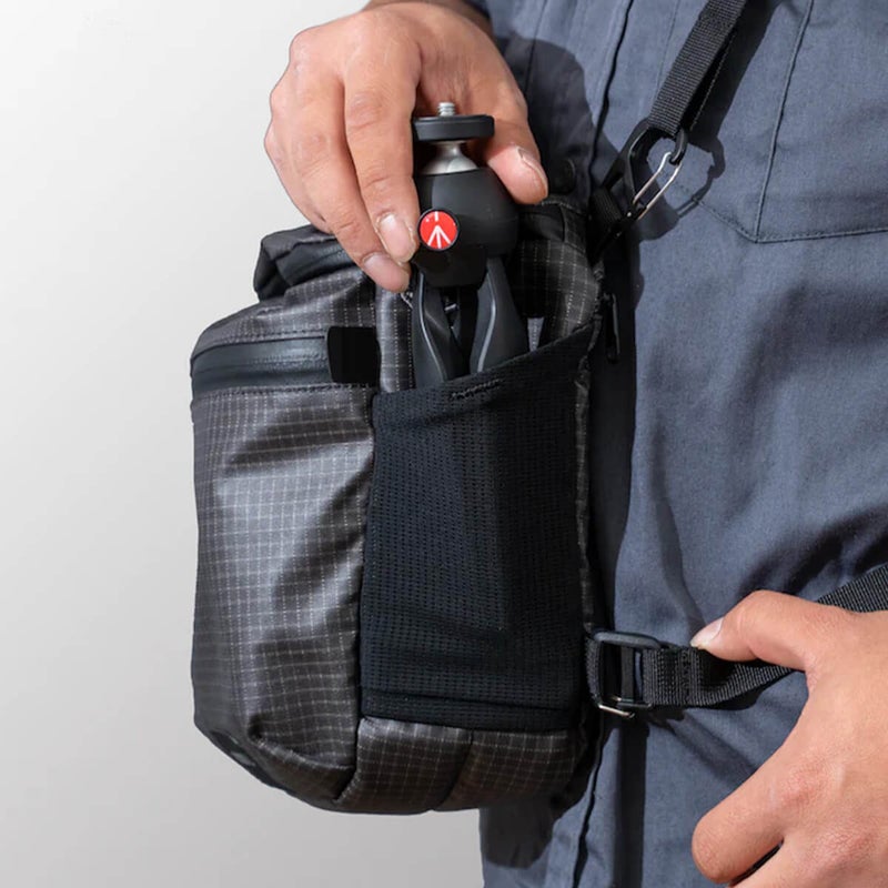 レンズキャップやミニ三脚が素早く出し入れできるストレッチメッシュポケットを左右に1つずつ装備。